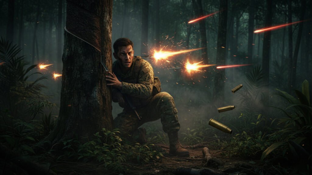 That afternoon, we are patrolling through an old, abandoned French rubber tree plantation. Suddenly, all hell breaks loose. We hear bullets whizzing by most appear to be at kneecap level.